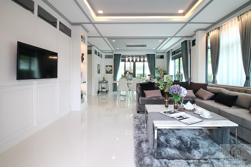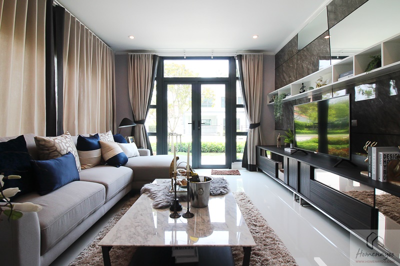 มาดูไอเดียการจัดเฟอร์นิเจอร์ภายในบ้านกันค่ะ เริ่มจากห้องนั่งเล่นสามารถวางโซฟาตัว L ขนาดใหญ่พิเศษพร้อมกับโต๊ะกาแฟ 1 ตัว เพียงพอสำหรับคนประมาณ 5 – 6 คนเลย