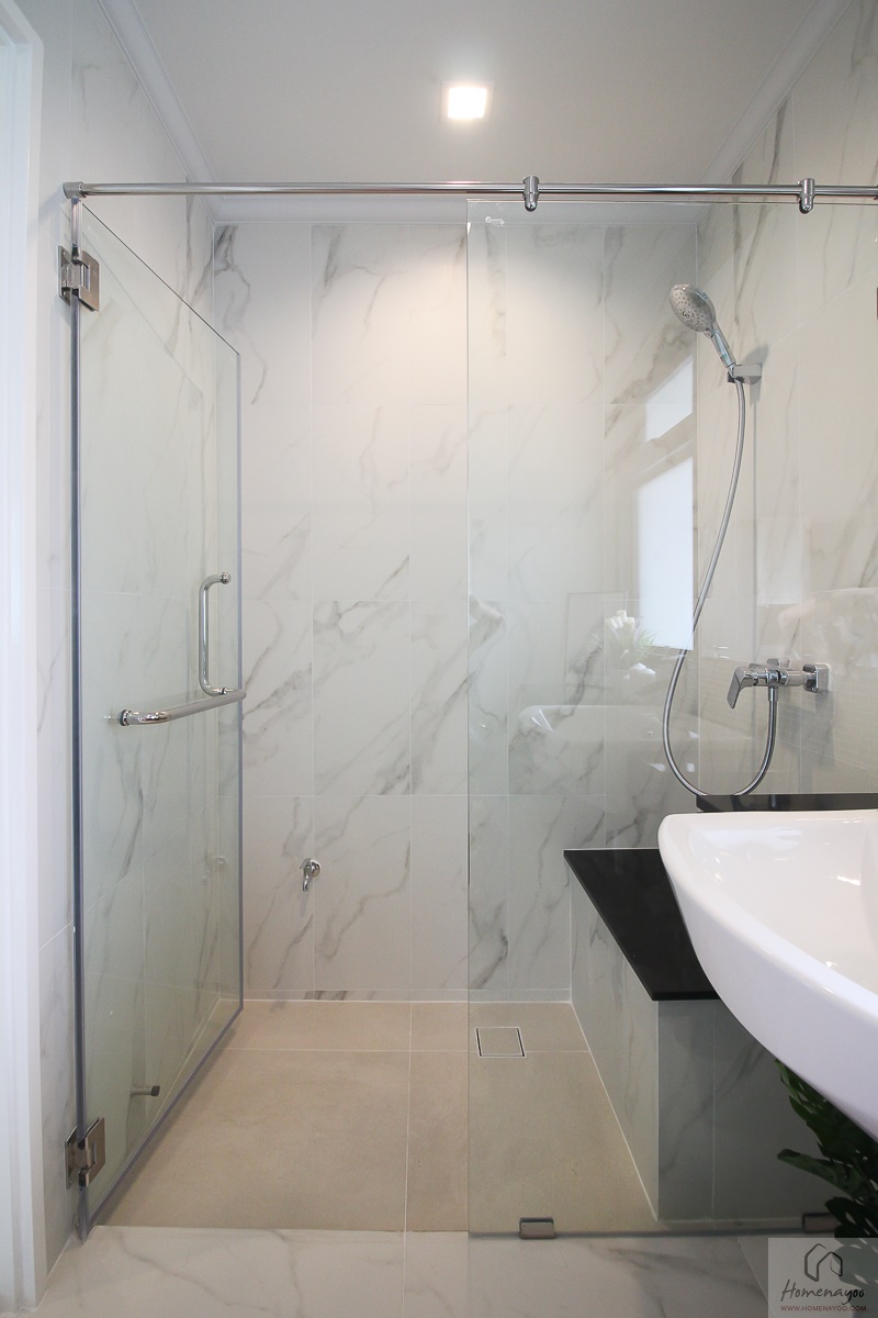 โซนอาบน้ำติดตั้งฉากกั้นอาบน้ำ Tempered Glass มาให้เรียบร้อย มือจับบานเปิดมีขนาดใหญ่สามารถใช้แขวนผ้าเช็ดตัวได้