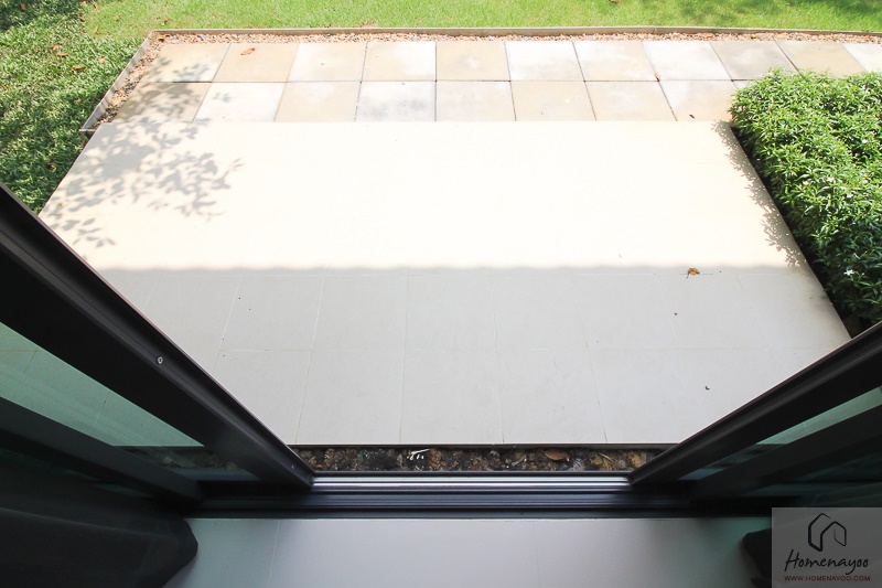 สังเกตโดยรอบบ้านมีประตูและหน้าต่างกระจกให้เยอะมากค่ะ ทำให้ภายในบ้านสามารถรับแสงแดดจากธรรมชาติได้อย่างเต็มที่ โดยชุดประตูและหน้าต่างภายนอกทั้งหมดเป็นบาน UPVC สีเทาของ Windsor ติดเขียวตัดแสง และติดตั้งมุ้งไฟเบอร์กันยุงมาให้ที่หน้าต่างทุกบานแล้ว