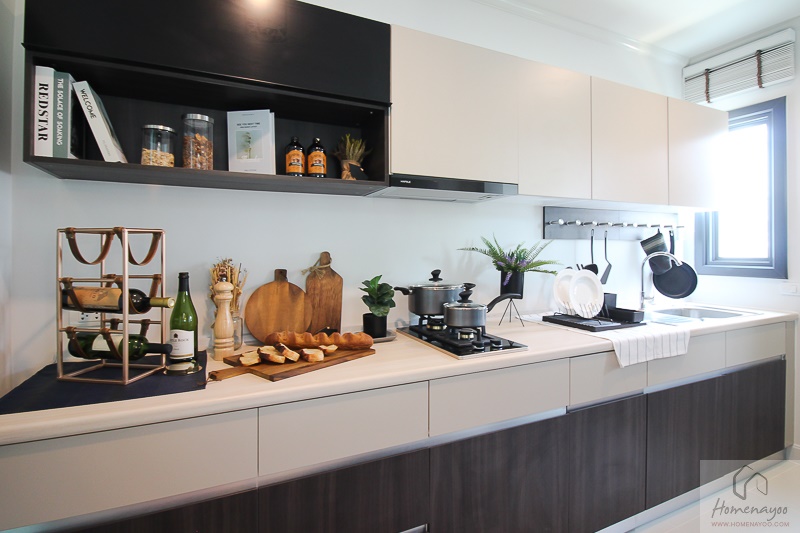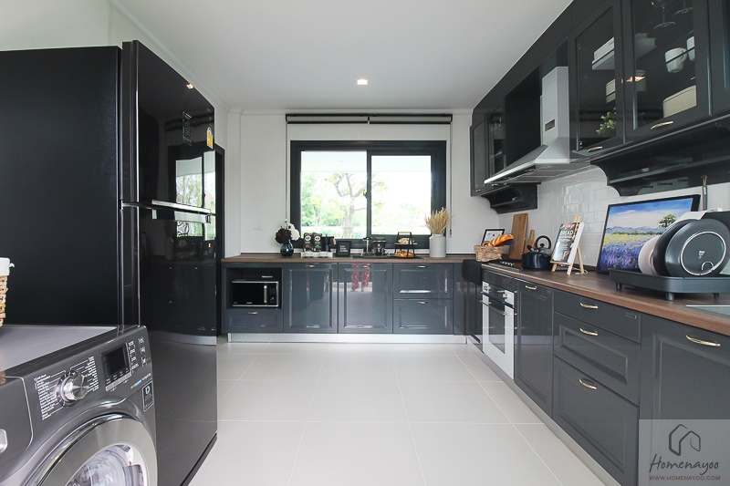 พื้นที่ห้องครัวของบ้านหลังนี้มีขนาดใหญ่มากนะคะ สามารถใช้เป็นครัวไทยได้สะดวกไม่จำเป็นต้องทำการต่อเติมเพิ่มเลย โดยบ้านตัวอย่างได้วางเคาน์เตอร์ครัวตัว L มาให้ดูเป็นไอเดีย พื้นห้องครัวปูด้วยกระเบื้อง Cergres ขนาด 60 x 60 ซม. แบบผิวด้านกันลื่นค่ะ