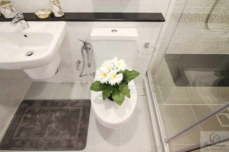 สิ่งที่แตกต่างจากห้องน้ำในห้องนอนใหญ่ก็คือ ได้โถสุขภัณฑ์แบบแยกชิ้นรุ่นมาตรฐาน, ไม่มีอ่างอาบน้ำ, ไม่มี Rain Shower และต้องติดตั้งฉากกั้นอาบน้ำเพิ่มเติมค่ะ