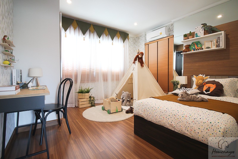 บ้านตัวอย่างจัดเป็นห้องนอนเด็กให้ดูเป็นไอเดีย ใช้เตียงนอนที่มีหัวเตียงทรงจั่วสามารถเข้าไปนั่งเล่นได้ ส่วนที่นอนเป็นลักษณะของลิ้นชักวางฟูกที่สามารถดึงออกมาหรือเลื่อนเก็บเข้าไปได้ช่วยประหยัดพื้นที่ รวม ๆ คือวางเตียงขนาด 5 ฟุตได้พอดีค่ะ