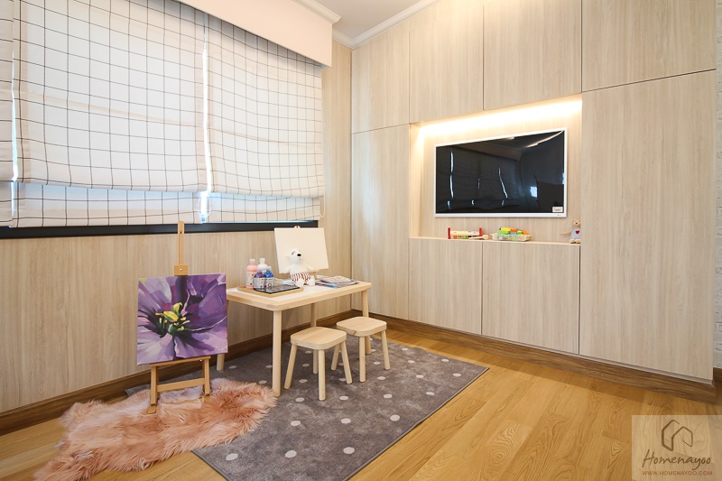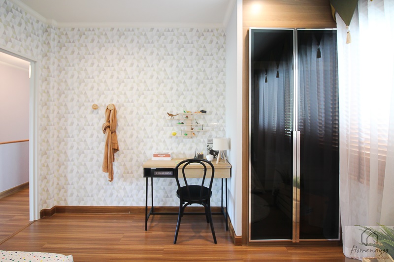 พื้นที่อีกมุมจัดเป็นโซนสำหรับการเรียนรู้และงานอดิเรก ถ้าเป็นเฟอร์นิเจอร์มาตรฐานคือวางโต๊ะทำงานขนาดใหญ่ได้เลยค่ะ