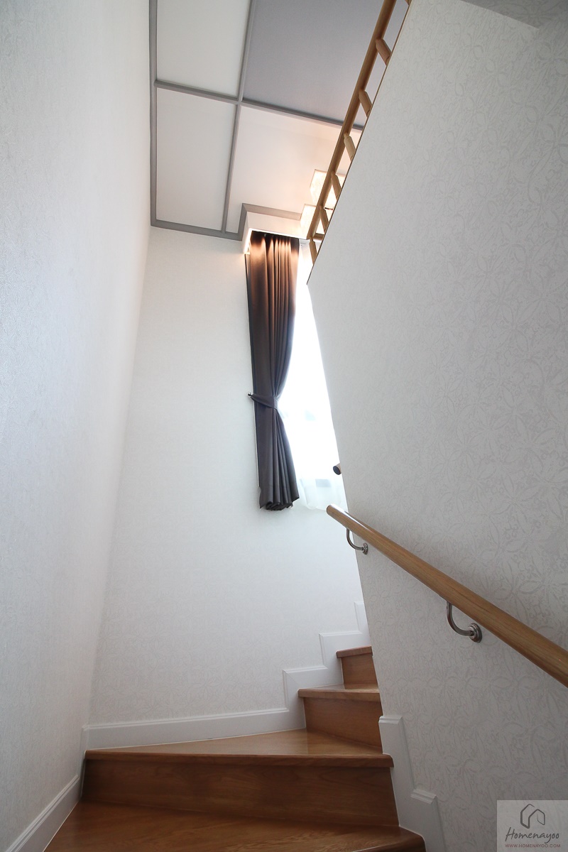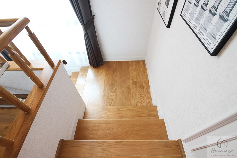 เราจะขึ้นไปดูที่ชั้น 2 กันต่อค่ะ บันไดใช้โครงสร้างคอนกรีตแข็งแรง ปิดผิวด้วยไม้ประสานปิดผิวไม้โอ๊คทั้งลูกนอนและลูกตั้ง ที่บันไดขั้นแรกทำโค้งเข้ามุมรับกับผนังพอดีไม่มีแง่มุมให้เกิดอันตรายค่ะ ดีไซน์ออกมาดูหรูทีเดียว ผนังด้านข้างติดราวจับบันไดแบบโครงเหล็กฝังผนัง มือจับใช้ไม้สีเข้ากันกับพื้นบันได