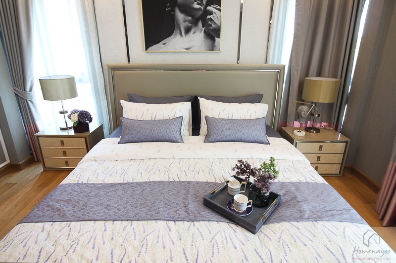 พอวางเตียงนอนขนาด 5 – 6 ฟุตแล้วก็ยังเหลือพื้นที่ 2 ฝั่งวางโต๊ะข้าง