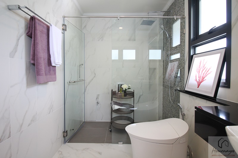 จะเห็นเลยว่าห้องน้ำของบ้านหลังนี้ถูกออกแบบให้ดูหรูขึ้นมาอีกระดับด้วยกระเบื้องพอร์ซเลนลายหินอ่อนและกระเบื้องโมเสกอย่างสวยงาม สุขภัณฑ์ใช้ของ Cotto ทั้งหมด