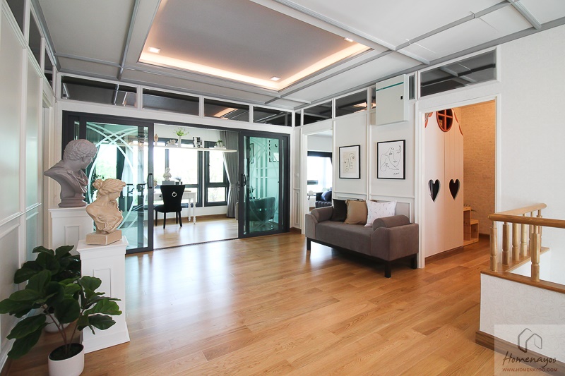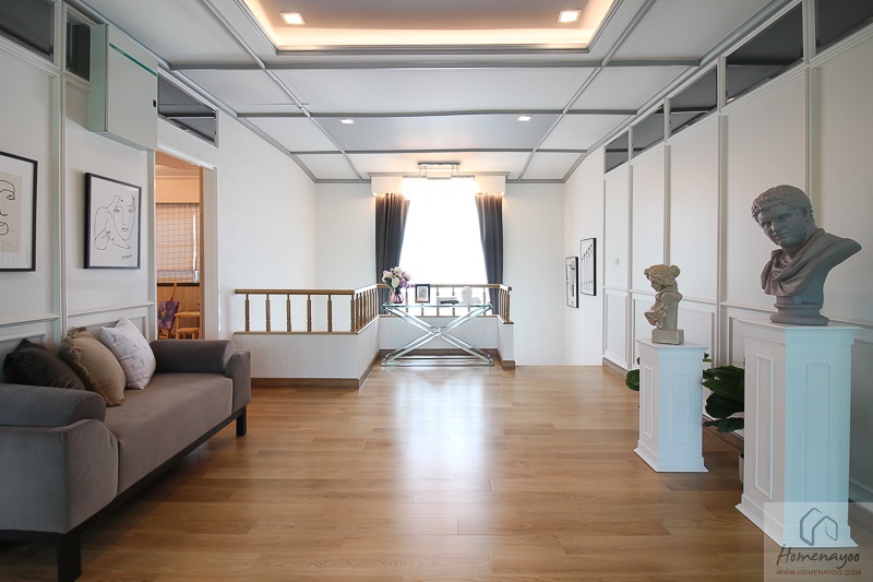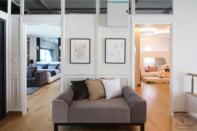 จริง ๆ พื้นที่โถงบันไดนี้มีขนาดกว้างขวางมากเลยนะคะ เราสามารถจัดเป็นห้องพักผ่อนครอบครัวได้อีก 1 ห้องเลย