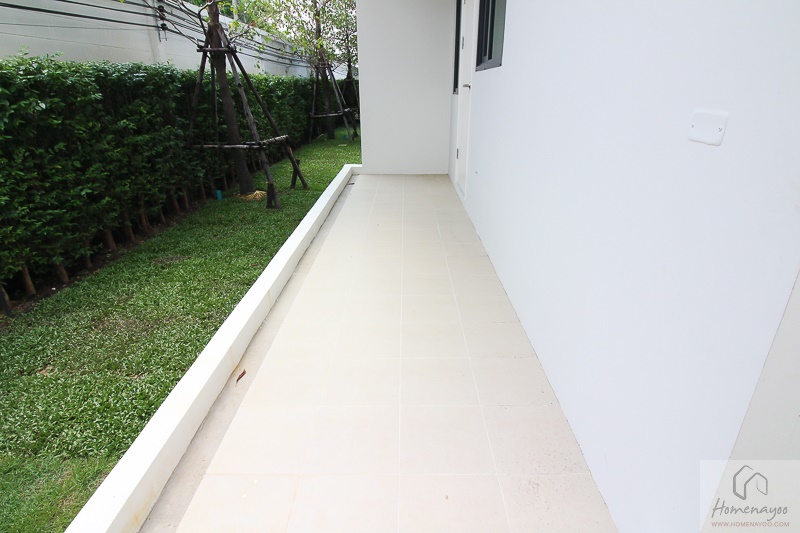 จากพื้นที่จอดรถมีทางเดินเชื่อมต่อไปยังเฉลียงหน้าบ้าน ปูด้วยกระเบื้องขนาด 30 x 60 ซม. ล้อมด้วย Boarder ทรายล้างสีทอง