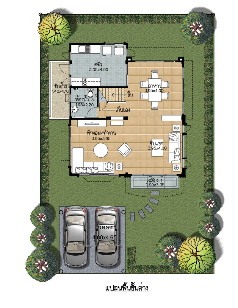 – 1 ส่วนพักผ่อน และที่จอดรถ 2 คัน
