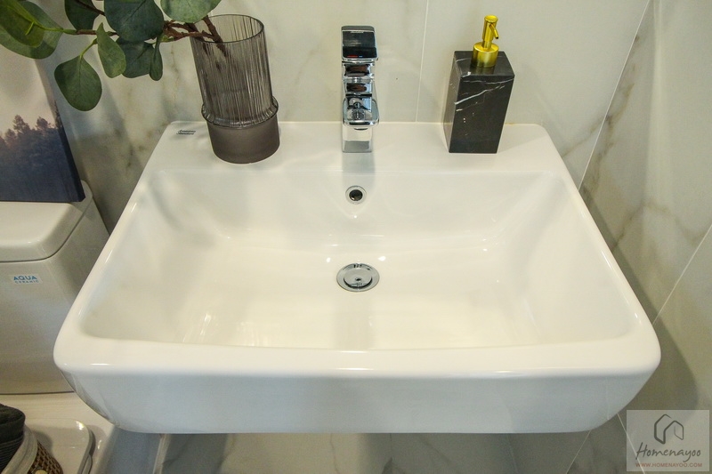 อ่างล้างหน้าแบบฝังเคาน์เตอร์ พร้อมก๊อกน้ำโครเมียมก้านโยกทรงสูง ส่วนตัวเคาน์เตอร์จะเป็นหินแกรนิตแนวยาว วางของใช้ต่าง ๆ ได้เยอะมาก ผนังติดกระจกเงาให้ 1 บาน งานระบบต่าง ๆ ถูกติดตั้งไว้ที่ใต้อ่างเรียบร้อย