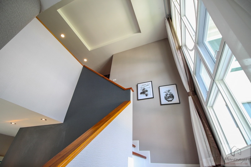 มองกลับมาที่โถงบันไดตรงนี้จะได้เพดานสูงแบบ Double Volume และติดหน้าต่างช่องแสงขนาดใหญ่พิเศษ ที่มีทั้งตัวบานฟิกซ์ และ บานเปิดระบายอากาศ ด้านบนเพดานสามารถติดโคมไฟดีไซน์สวย ๆ ได้เลยตามชอบ