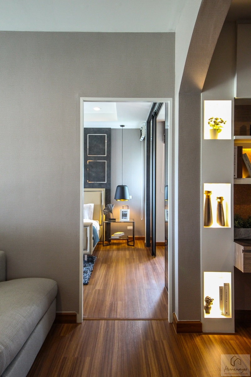 ปลายเตียงนอนตกแต่งด้วยชั้นวางทีวีความยาวเกือบพอดีผนังมาให้ดูเป็นไอเดีย บ้านจริงสามารถบิวท์อินชั้นวางทีวี พร้อมตู้โชว์ขนาดใหญ่ได้ ผนังด้านหลังมีการเดินงานระบบไฟฟ้าต่าง ๆ มาให้เรียบร้อยค่ะ