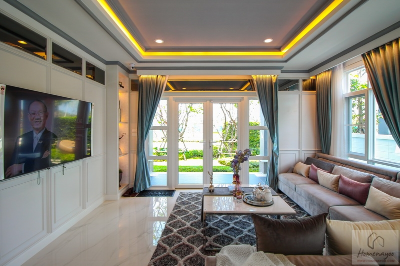 ด้วยการออกแบบที่รองรับการวางเฟอร์นิเจอร์ได้เป็นอย่างดี ทำให้มีระยะห่างจากโซฟา-ทีวี มากเกือบ 4 เมตร สมาชิกในครอบครัวนั่งพักผ่อนดูทีวีได้ในระดับสายตาที่ดี ทั้งยังสามารถเดินเข้า-ออกไปส่วนอื่น ๆ ของบ้านได้สะดวกอีกด้วยค่ะ