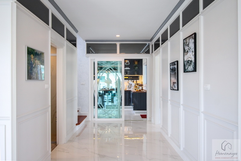 โถงทางเดินกว้างประมาณ 2.5 เมตร ซ้ายมือจะเป็นห้องน้ำชั้นล่าง และ โถงบันได ด้านหน้าเป็นห้องครัวปิด ที่เชื่อมต่อกับพื้นที่ซักล้างหลังบ้านได้ และ ขวามือเป็นห้องนอนชั้นล่าง ที่สามารถ Connect ไปยังเฉลียงและสวนหน้าบ้านได้