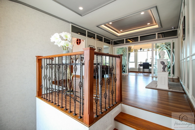 ขึ้นมาที่ชั้น 2 จะเจอกับโถงบ้านกว้าง ๆ ตรงนี้จะติดราวไม้สีเข้ม ผสมระแนงเหล็กดัดสีน้ำตาลเข้มเข้ากันกับสีไม้ ดูหรูหราสวยงามดี