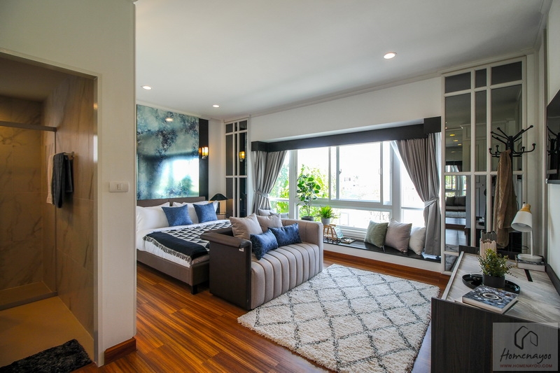 ข้างเตียงนอนฝั่งขวามือจะเป็น Bay Window ที่สามารถก่อม้านั่งตัวยาว ทำเป็นมุมนั่งเล่นพักผ่อนได้ หรือจะปรับให้เป็นมุมทำงานแบบ Work From Home ก็ลงตัวดีทีเดียวค่ะ