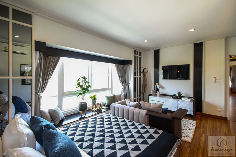 ปลายเตียงนอนมีพื้นที่เหลือเยอะ สามารถวางชั้นวางทีวีขนาดใหญ่ได้ โดยที่ผนังจะมีการเดินงานระบบต่าง ๆ มาให้เรียบร้อย พร้อมต่อใช้งาน