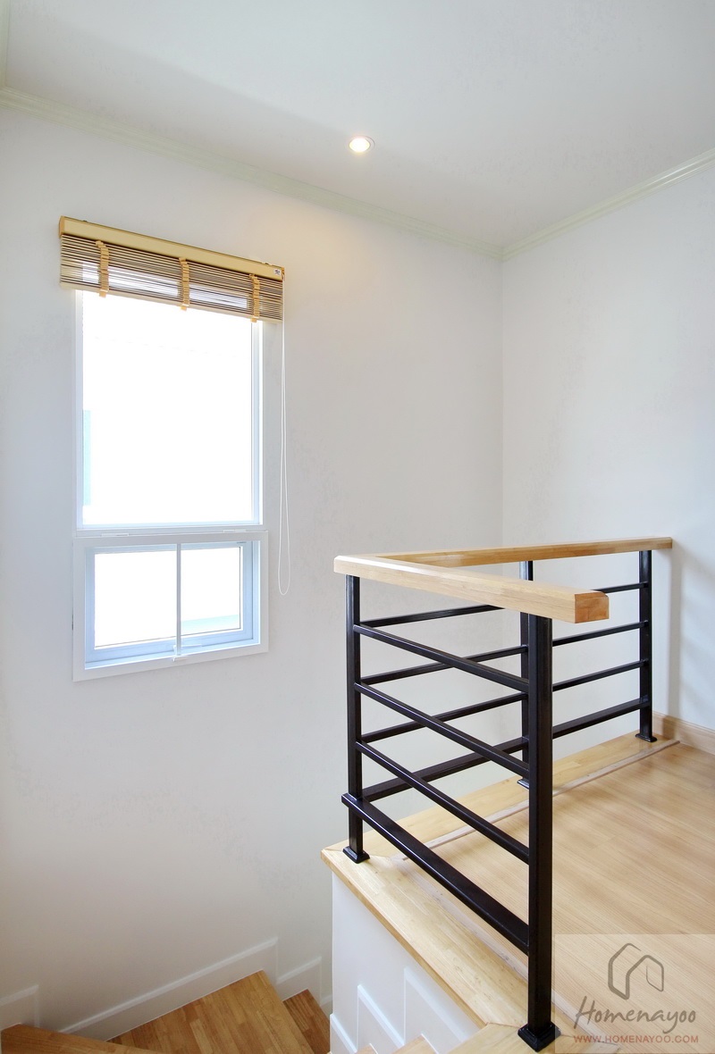 ขึ้นไปดูรายละเอียดชั้น 2 กันต่อ..บันไดบ้านโครงสร้างคอนกรีตเสริมเหล็กแข็งแรงทนทาน เดินขึ้น-ลงไม่มีเสียง ลูกนอนเป็นไม้ยางพาราประสาน ราวบันไดเหล็กกล่องทาสีขาวน้ำมัน มือจับไม้ยางพาราประสานชนิดเดียวกับลูกนอน