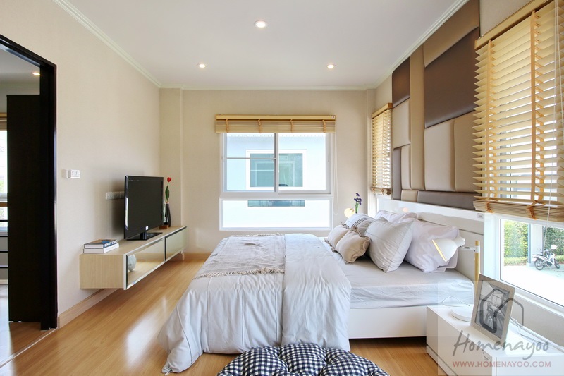 บ้านตัวอย่างวางเตียง 3.5 ฟุต ชิดผนังให้ดูระยะใช้งาน