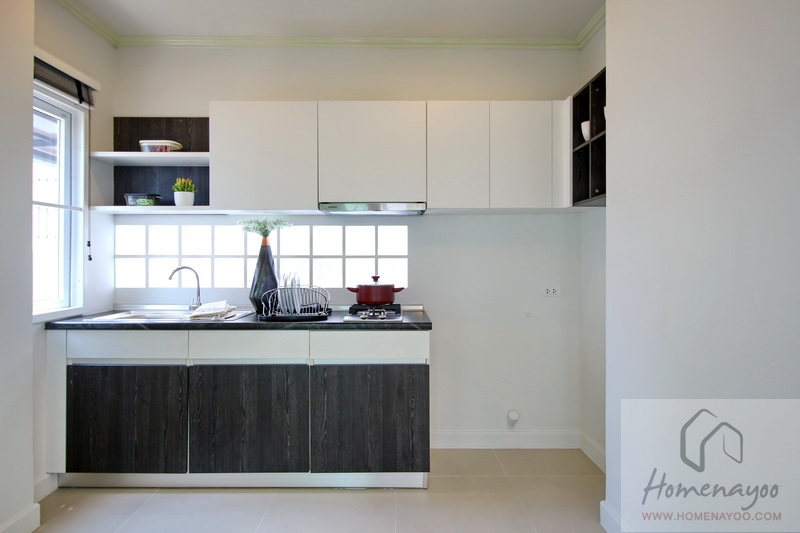 เข้ามาด้านในพื้นที่ใช้งานกว้างกำลังดี ปูพื้นแกรนิตโต้สีครีม 60 x 60 ซม. ต่อเนื่องมาจากด้านนอก โครงการบิวท์อินเคาน์เตอร์ครัว ขนาด 1.8 x 0.60 เมตร ใหดู้ระยะใช้งาน ผนังด้านหลังเป็นอิฐบล็อกแก้ว เช็ดล้างได้ง่าย ติดกันมีหน้าต่างบานกระทุ้ง พร้อมมุ้งลวด ซึ่งจะช่วยระบายอากาศ-ระบายกลิ่นในห้องครัวได้ดี อีกทั้งช่องแสงจากหน้าต่างยังช่วยให้ครัวไม่อับชื้น มีแสงเพียงพอในตอนกลางวัน และยังช่วยประหยัดพลังงานได้อีกด้วยค่ะ