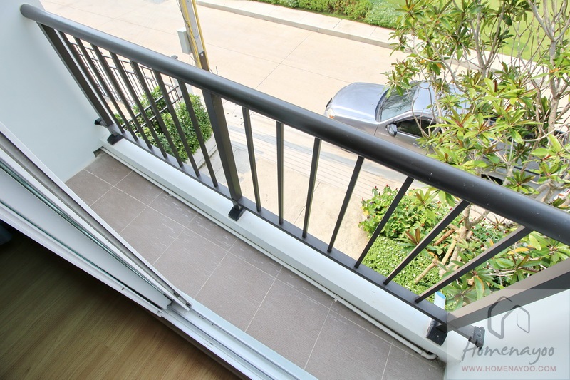 ระเบียงปูกระเบื้องเซรามิกกันลื่น มีพื้นที่ใช้งานขนาดพอเหมาะกำลังดี ติดตั้งราวเหล็กมือจับสแตนเลสให้แบบในภาพ