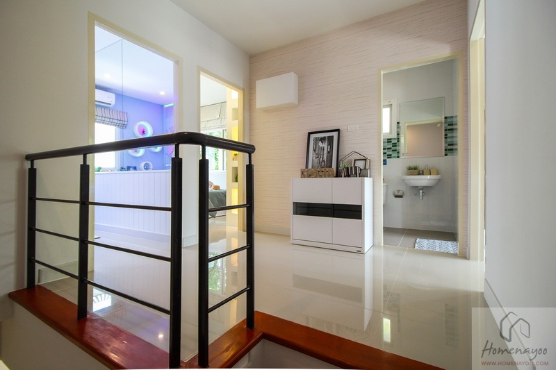 มองกลับมาที่โถงบันไดจะมีพื้นที่อเนกประสงค์ให้วางชั้นวางของ, ตู้เก็บของ หรือ ตะกร้าผ้าได้ ผนังตรงโถงจะมีหน้าต่างช่องแสงและหน้าต่างบานกระทุ้งติดมาให้ 1 บาน
