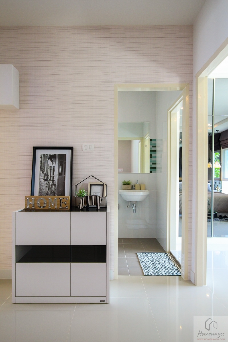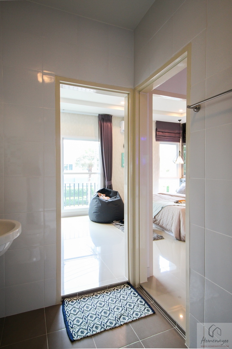 จากห้องนอนจะมีประตูเชื่อมต่อกับห้องน้ำได้ด้วย โดยฟังก์ชันห้องน้ำชั้น 2 เป็นแบบ Double Access สามารถเข้า-ออกได้จากห้องนอนใหญ่ และ โถงบ้านชั้น 2