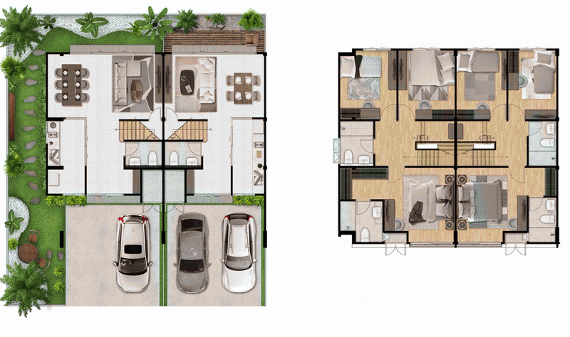 ตัวบ้านแปลงมุมมีหน้ากว้าง 6.25 ม. ส่วนบ้านแปลงกลางหน้ากว้างอยู่ที่ 5.5 ม. มีที่จอดรถด้านหน้าได้ 2 คัน พื้นเทคอนกรีตขัดเรียบแบบ On Ground