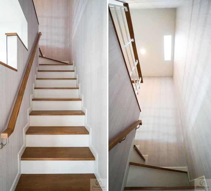โครงสร้างบันไดบ้านคอนกรีตเสริมเหล็ก ปิดผิวด้วยไม้สำเร็จรูป ตรงบันไดมีพื้นที่ไว้ให้วางของตกแต่ง หรือวางกระเป๋าเดินทางได้
