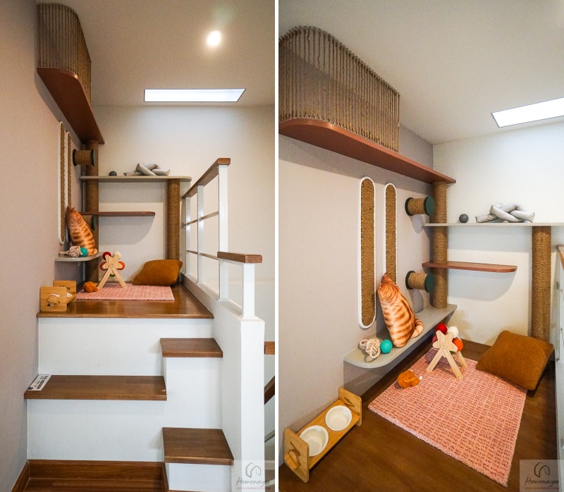 ตรงพื้นที่ชั้นลอยทำเป็นขั้นบันไดเดินขึ้นไปไว้ให้ บ้านตัวอย่างทำเป็นพื้นที่สัตว์เลี้ยง สำหรับน้องแมวมาให้ดูเป็นไอเดีย