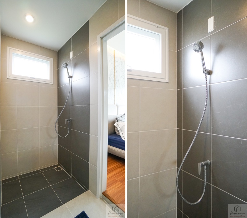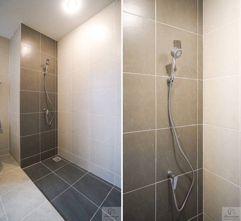 อีกมุมเป็นพื้นที่ส่วนเปียก สามารถติดตั้งฉากกั้นอาบน้ำเพิ่มเองได้ ด้านในติดตั้ง Hand Shower พร้อมเดินงานระบบไฟฟ้าติด Junction Box รองรับการติดตั้งเครื่องทำน้ำอุ่นมาให้เรียบร้อย