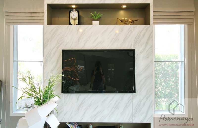 ตรงข้ามโซฟาเป็นพื้นที่สำหรับวางทีวี ทางโครงการตกแต่งผนังลายหินอ่อนให้ดูเป็นไอเดีย โดยผู้อยู่อาศัยสามารถปรับเปลี่ยนการใช้งานได้อย่างอิสระ ตามไลฟ์สไตล์