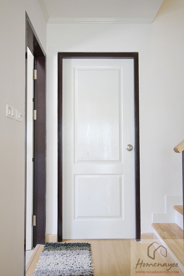 ประตูห้องพักทั้งหมด เป็นบานไวนิลลายลูกฟักทาสีขาว ลูกบิดทรงกลมสีเงิน วงกบประตูไม้เนื้อแข็งทาสีน้ำตาลเข้ม