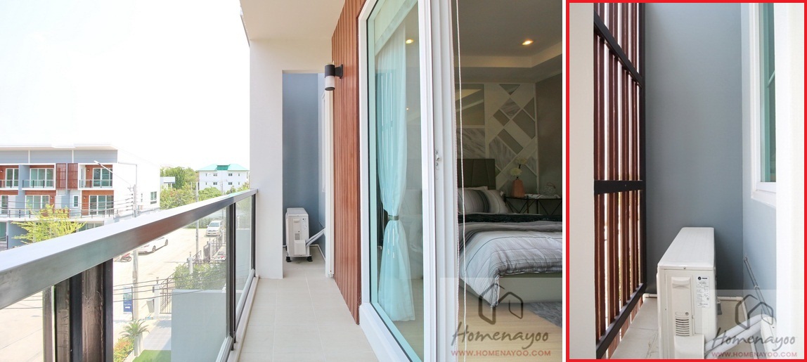มองไปทางขวามือ โครงการออกแบบให้มีพื้นที่สำหรับวางคอมเพรสเซอร์แอร์อย่างเป็นสัดส่วน พร้อมมีระแนงไม้บัง เพื่อความสวยงามของอาคาร เมื่อมองจากภายนอกเข้ามา