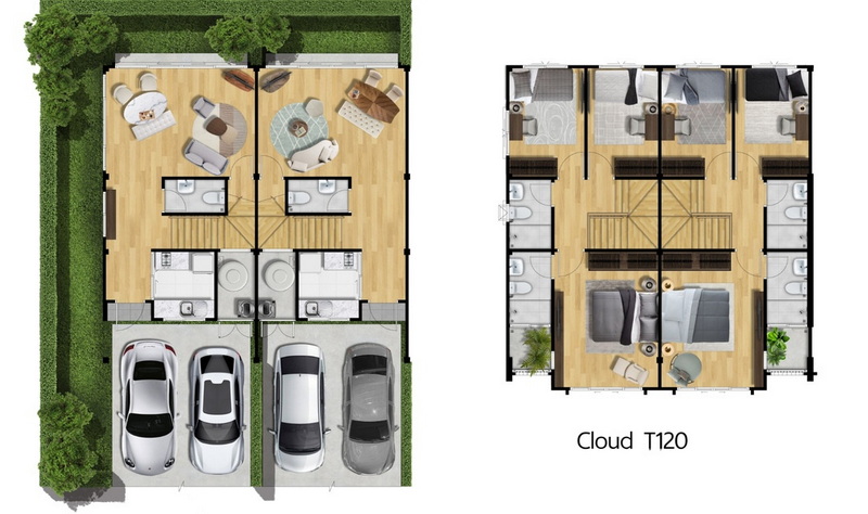 • แบบบ้าน Cloud 120 ทาวน์โฮม 2 ชั้น พื้นที่ใช้สอย 120 ตร.ม. ฟังก์ชันบ้าน 3 ห้องนอน 3 ห้องน้ำ ที่จอดรถ 2 คัน