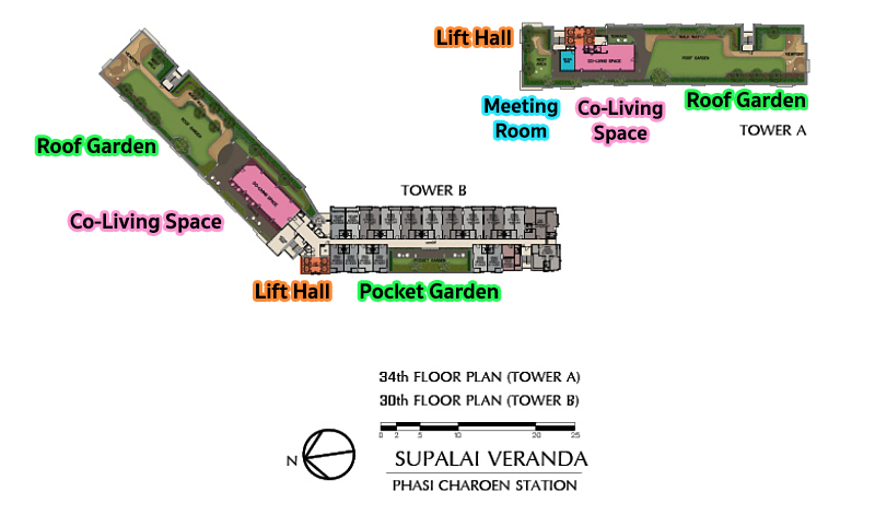 ส่วนชั้น 30 และ ชั้น 34 ซึ่งเป็นชั้นบนสุดของทั้ง 2 Tower จะเป็นพื้นที่ส่วนกลางที่มี Co-Living Space, Meeting Room, สวนพักผ่อนชั้นดาดฟ้า และ มีจุดชมวิวให้ด้วย Tower A มี ลิฟต์โดยสาร แบบล็อกชั้น 4 ตัว + ลิฟต์บริการ 1 ตัว และ Tower B มีลิฟต์โดยสาร แบบล็อกชั้น 5 ตัว + ลิฟต์บริการ 1 ตัว