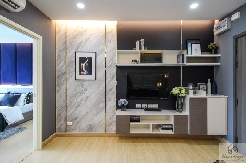 อีกฝั่งบิวท์อินตู้วางทีวี + ตู้เก็บของมาให้ดูเป็นไอเดีย ห้องจริงสามารถ Custom กันได้ตามชอบ ผนังด้านหลังเดินงานระบบไฟฟ้า และช่องเสียบสายเคเบิลทีวีมาให้เรียบร้อย พร้อมต่อใช้งานได้เลยค่ะ