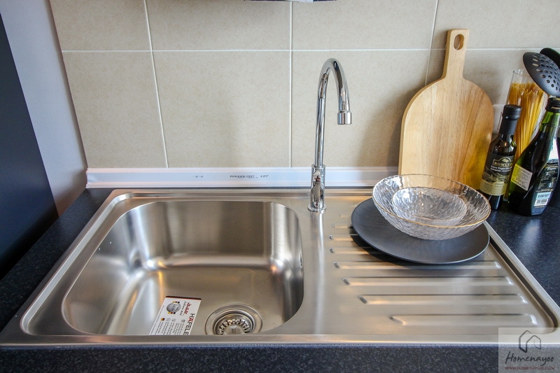 ถัดมาเป็นชุดครัวที่ได้มากับตัวห้อง ขนาด ประมาณ 1.5 x 0.60 เมตร มาพร้อมตู้เก็บของบน-ล่าง, ซิงค์ล้างจาน และ Backsplash กันเปื้อน ส่วนเตาไฟฟ้า และ เครื่องดูดควันไม่ได้มีให้นะ ต้องซื้อมาติดเพิ่มเองค่ะ