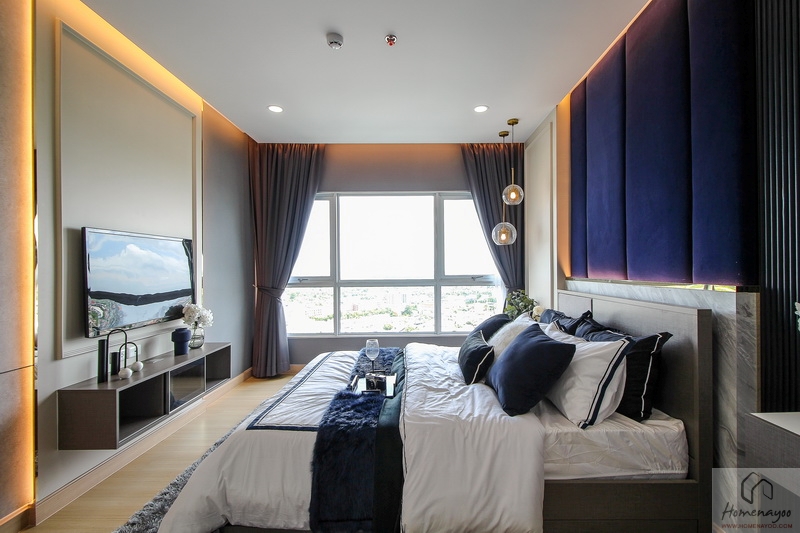 ปลายเตียงนอนตกแต่งผนัง และติดทีวี LED 42 นิ้ว มาให้ดูเป็นแนวทาง ห้องจริงเป็นผนังวอลเปเปอร์เปล่า ๆ ที่มีการเดินงานระบบไฟฟ้ามาให้พร้อม และ ติดแอร์ Wall Type ของ Trane ขนาด 12,000 BTU มาให้ด้วย 1 เครื่องค่ะ