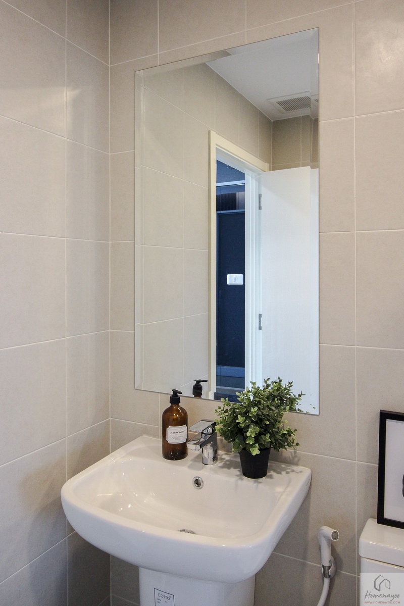 อ่างล้างหน้าขอบมนแบบแขวนผนัง ก๊อกน้ำโครเมียมก้านโยก เปิด-ปิดใช้งานสะดวก หน้าอ่างมีพื้นที่เหลือให้วางขวดสบู่ หรือ ถ้วยใส่ยาสีฟัน-แปรงสีฟันได้ ผนังติดกระจกเงาสี่เหลี่ยมเจียปรีทรงสูงให้ 1 บาน
