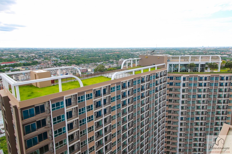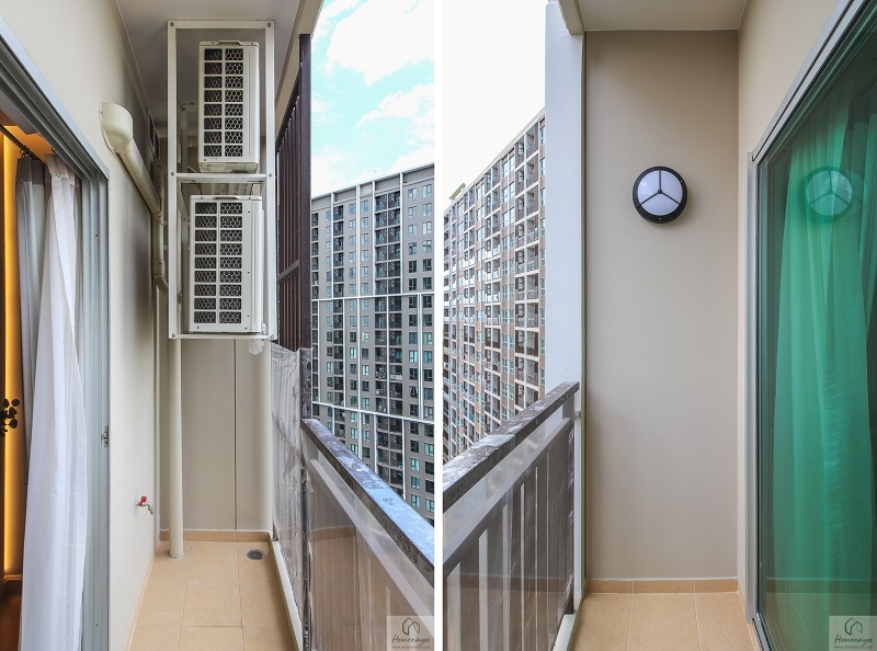 ห้อง Type นี้จะได้เป็นระเบียงแบบหน้ากว้าง ปูพื้นกระเบื้องเซรามิกสีเบจกันลื่น 30 x 30 ซม. สามารถวางต้นไม้กระถาง, ปลูกผักสวนครัวเล็ก ๆ หรือ วางราวตากผ้าขนาดกลางได้