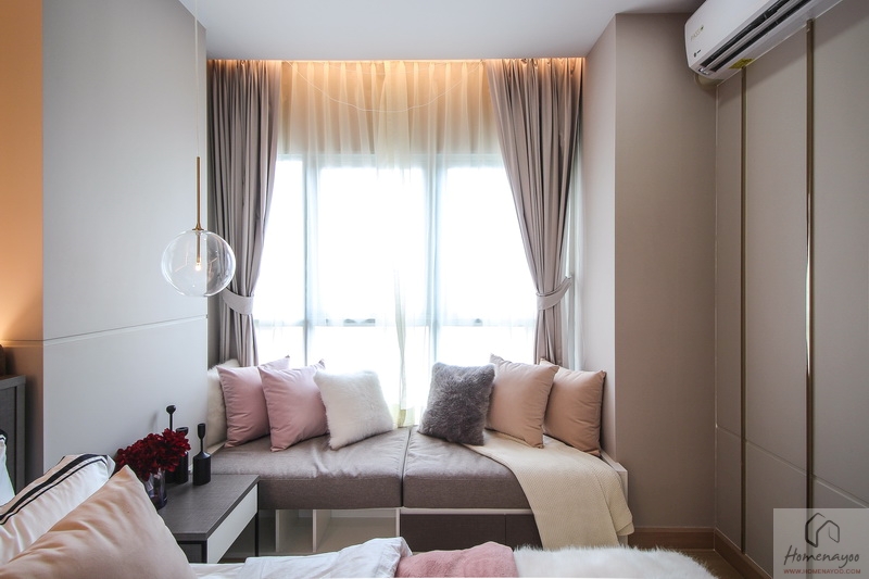 ข้างเตียงนอนฝั่งขวาจะเป็นพื้นที่เว้นลึกลงไป ตรงนี้จะวางโซฟา ขนาด 2 ที่นั่งได้พอดี ๆ หรือจะเปลี่ยนให้เป็นมุมทำงานแบบ 1-2 ที่นั่ง ชิดริมหน้าต่างก็ได้ / ในส่วนของหน้าต่างจะเป็นบานฟิกซ์ ผสมบานกระทุ้งแบบ Full Height ตามเดิมเลยค่ะ