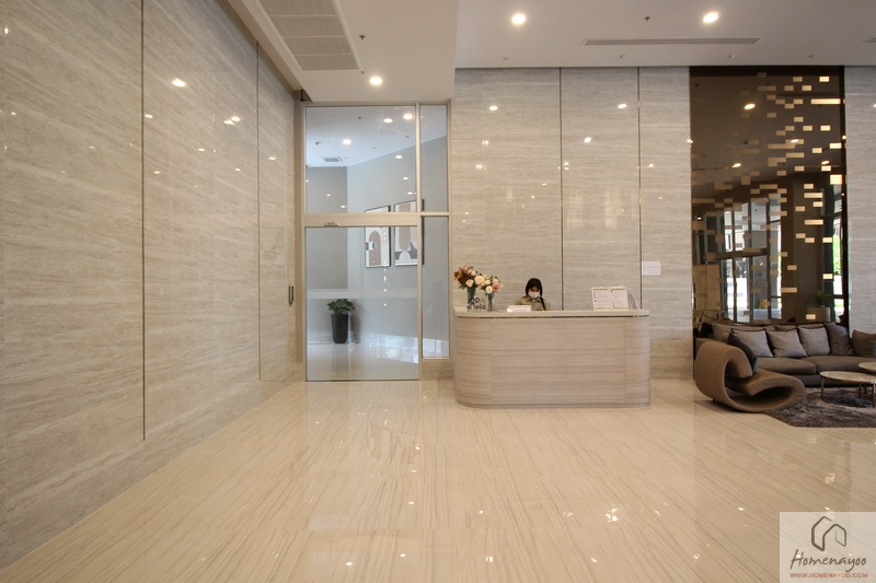 เปิดประตูเข้ามาภายในห้องพัก จะเจอกับ Common Area ซ้ายมือเป็นห้องครัวปิด ถัดไปเป็นมุมทานอาหาร ความสูงพื้น-เพดานอยู่ที่ 2.55 เมตร เช่นกัน วัสดุพื้นห้อง, วอลเปเปอร์, ฝ้าเพดาน, โคมไฟ และ ระบบป้องกันอัคคีภัยได้มามาตรฐานเดียวกันกับห้องก่อนหน้านี้เลยค่ะ