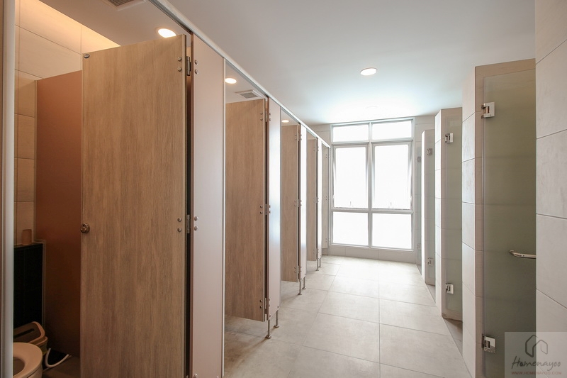 ด้านในสุดจะเป็นห้องน้ำ ติดประตูไม้บานทึบสีขาว ลูกบิดกลมกดล็อก และ ธรณีหินแกรนิตสีเทาให้ตามเดิม
