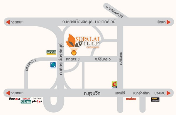 ♦ จากถนนสุขุมวิท มุ่งหน้าถนนเลี่ยงเมืองชล เลี้ยวขวาตรงแยกไฟแดง(สังเกตุปั๊มบางจากอยู่ซ้ายมือ) เข้าซ.ทุ่งสระ3 วิ่งตรงไปประมาณ 350 ม. โครงการอยู่ซ้ายมือ