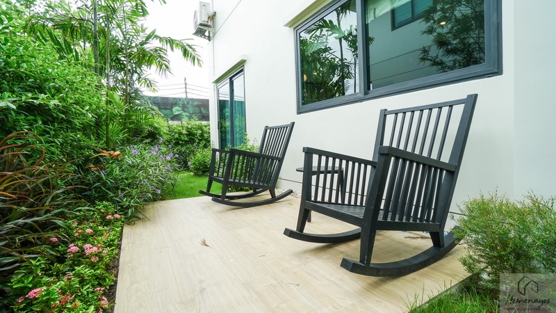 ระเบียงขนาดกว้างพอเหมาะติดราวระแนงเหล็กสีดำมาให้เรียบร้อย สามารถจัดเป็นมุมสวนเล็ก ๆ เพิ่มบรรยากาศธรรมชาติให้กับตัวบ้านได้ หรือจะวางเก้าอี้ที่มีขนาดไม่ใหญ่มากไว้นั่งรับลมชมวิวก็ดี