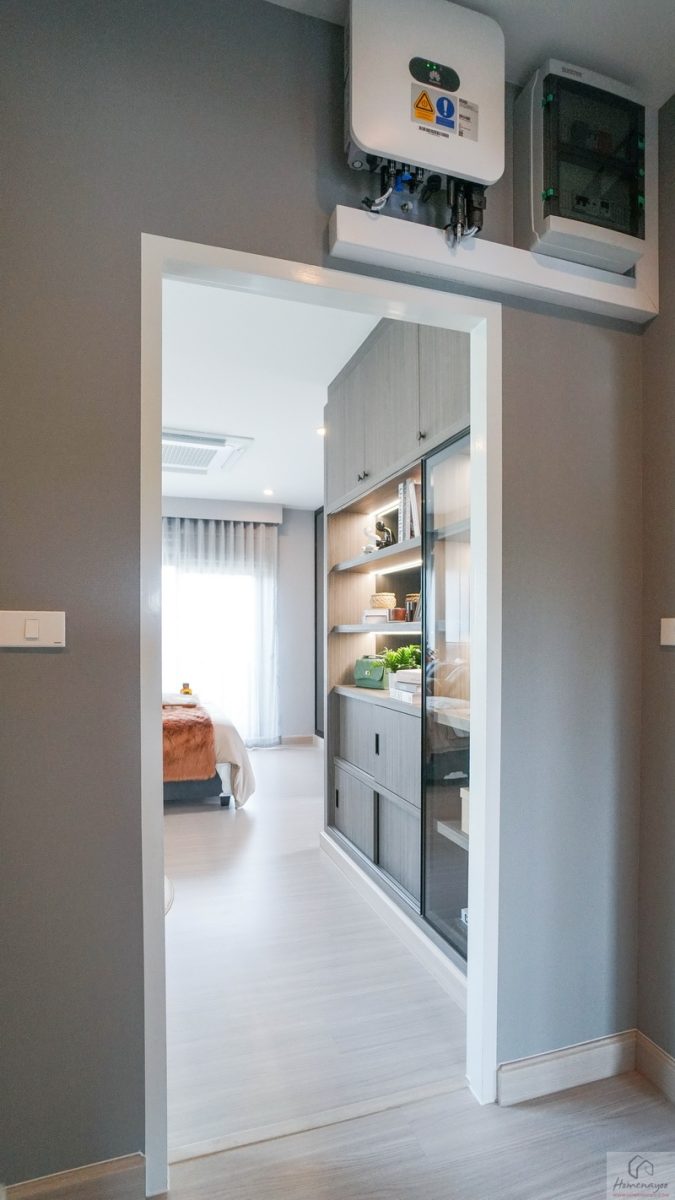 ฝั่งปลายเตียงผนังจุดนี้กว้างกำลังดี บ้านตัวอย่าง Built-in เป็นชั้นวางสวย ๆ ด้านข้างตกแต่งผนังด้วยระแนงไม้แนวตั้งเก๋ ๆ ช่วยเพิ่มมิติให้กับห้อง
