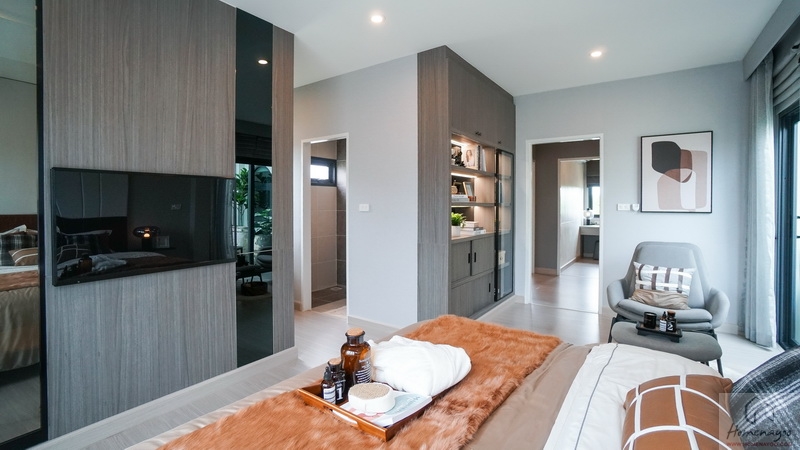 ฝั่งขวาหน้าบ้านเป็น Master Bedroom มีโซน Walk-in Closet, ระเบียงส่วนตัว และห้องน้ำในตัว