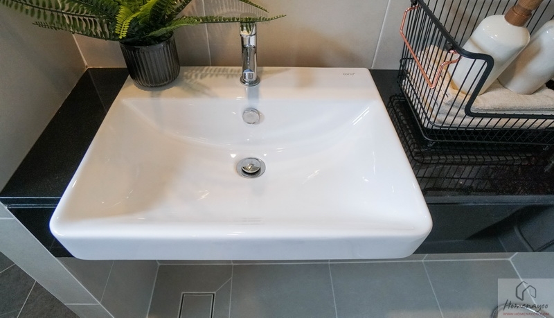 บริเวณมุมอ่างล้างหน้าใช้ทรงเหลี่ยมขอบมนแบบแขวนผนัง คู่กับก๊อกน้ำโครเมียมก้านโยกเปิด-ปิดใช้งานสะดวก ติดกระจกเงาทรงสี่เหลี่ยมบานใหญ่ให้ 1 บาน