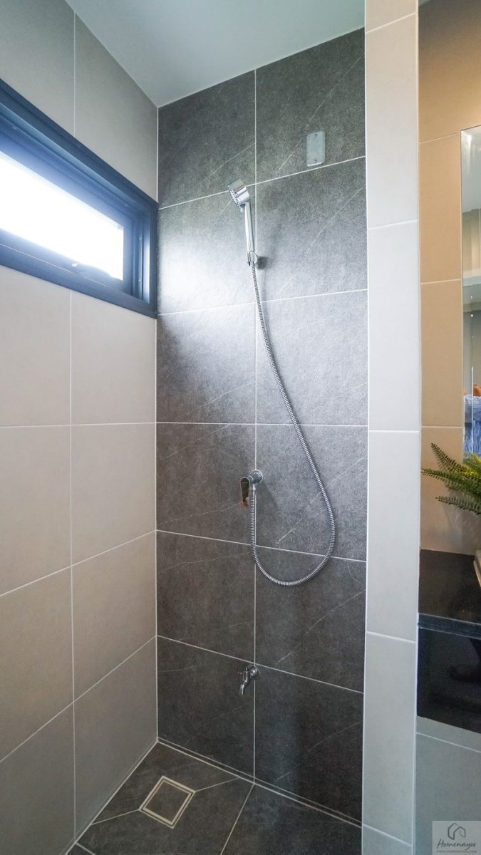 ใช้ฝักบัว Hand Shower คู่กับก๊อกน้ำโครเมียมก้านโยกแบบปัดขึ้น มีก็อกเพิ่มให้ 1 จุด บนผนังเดินระบบไฟฟ้ามี Junction Box สำหรับติดตั้งเครื่องทำน้ำอุ่นให้แล้ว